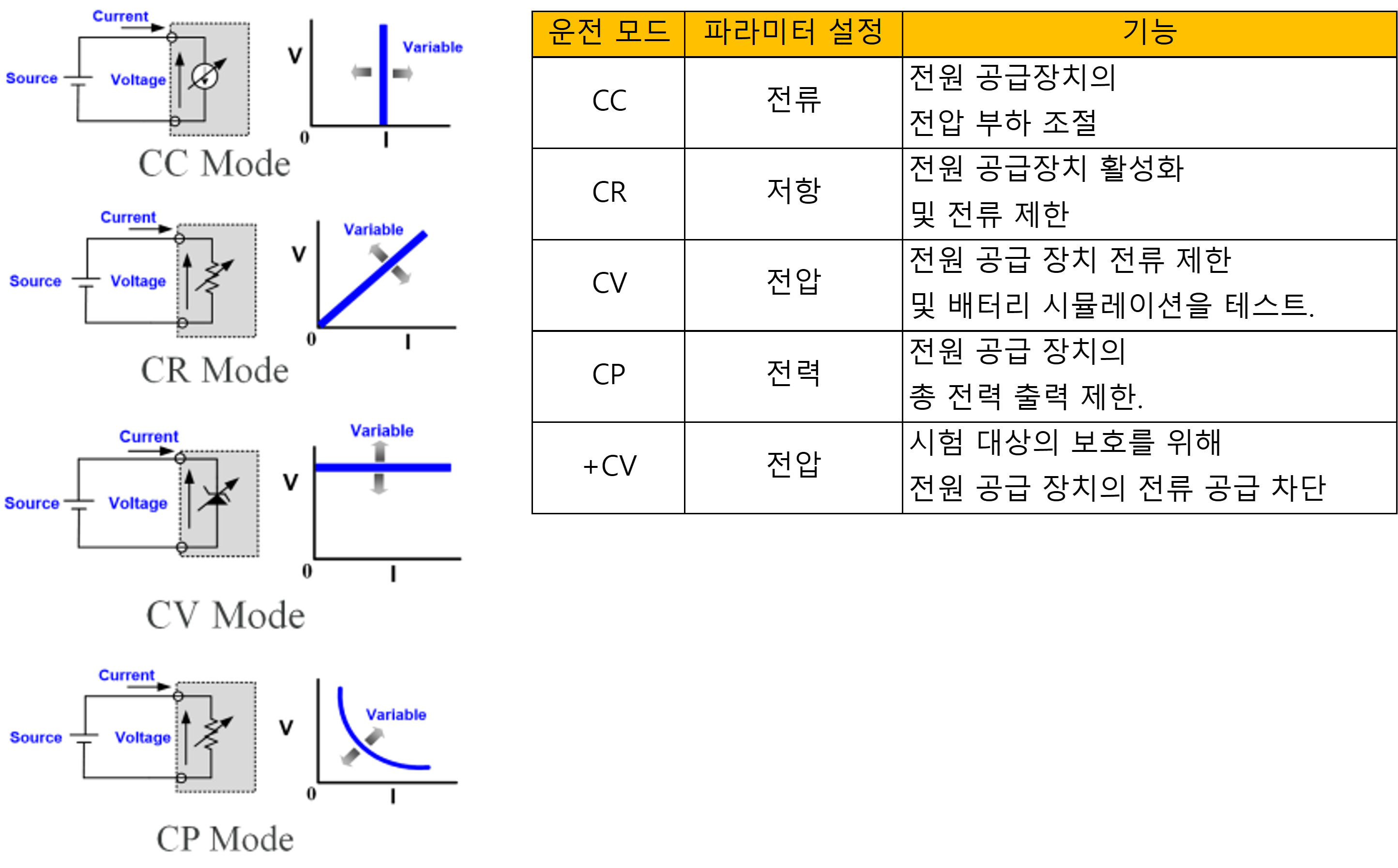 • 7 가지 운영 모드: CC, CV, CR, CP, CC+CV, CR+CV, CP+CV
