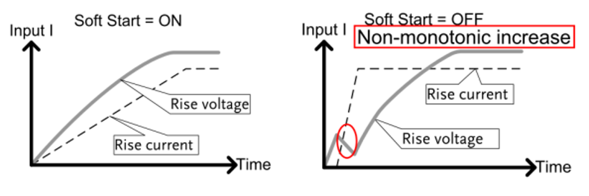 3. 예를 들어, 전원 공급, LED 및 DC 부하를 사용하는 시험 응용 프로그램(소프트 스타트 기능 활성화)은 인러쉬 전류와 과전압이 LED에 손상을 일으키는 것을 방지할 수 있습니다.