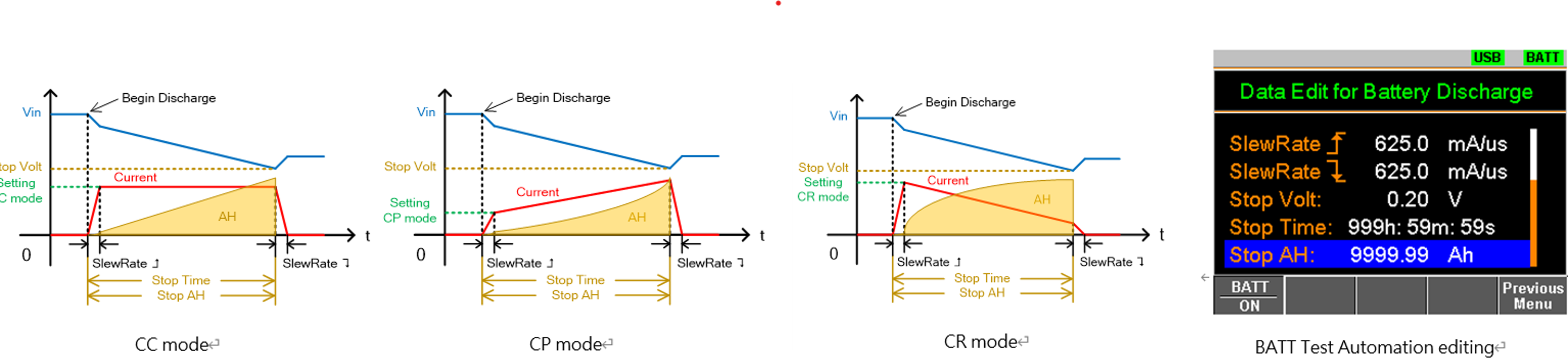 1. PEL-3000E의 내장 배터리 테스트 자동화 기능은 배터리 방전 응용 프로그램에 더 유연한 방전 중지 시간 설정과 방전 전류 설정을 위한 상승 및 하강 변화율을 제공합니다.