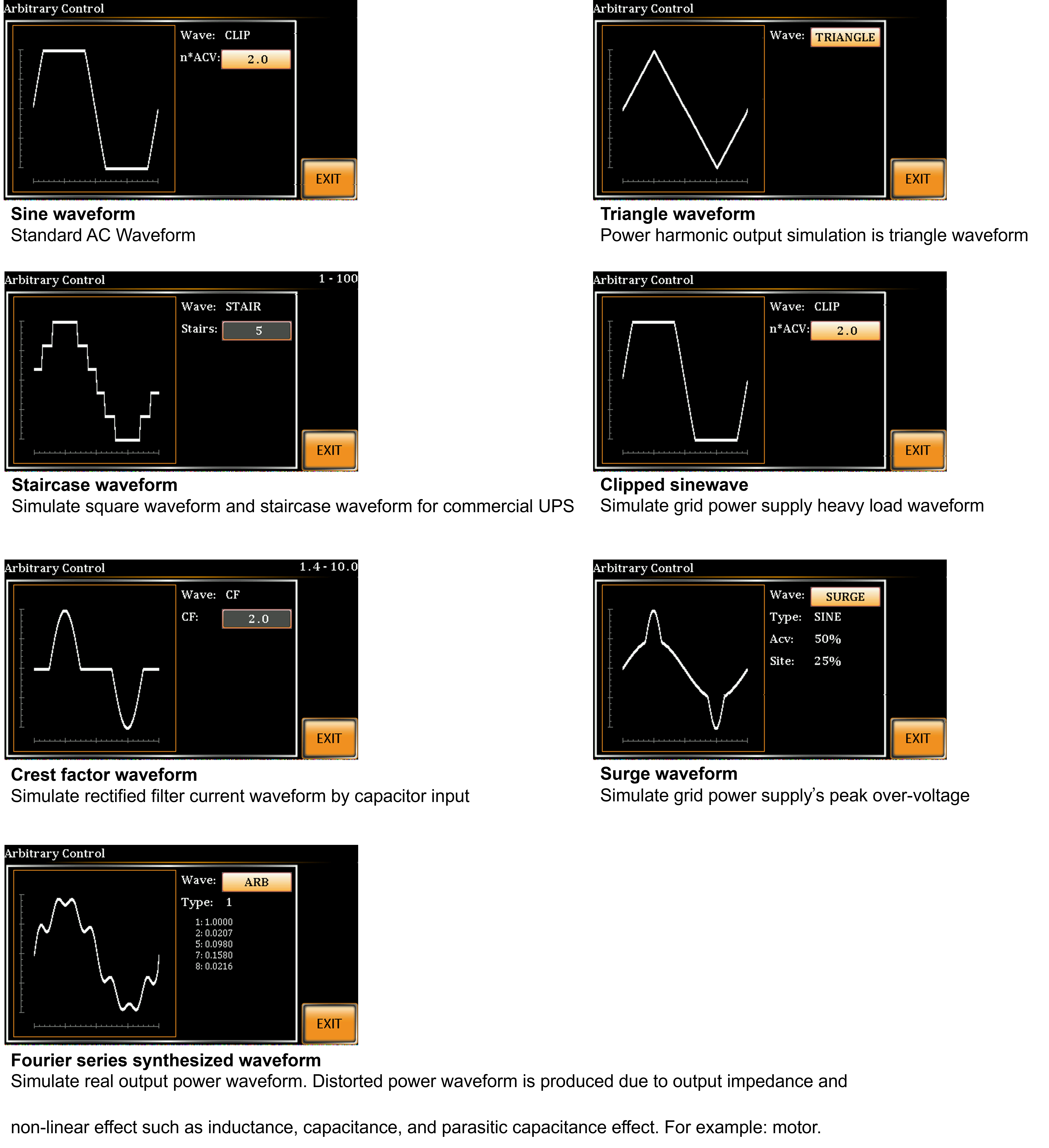 DUT가 변동 현상에 의해 겪는 영향을 평가하기 위해 엔지니어가 전원 장애, 전압 상승 및 전압 하락 등과 같은 다양한 모의 입력 임시 파형을 빠르게 생성할 수 있습니다. 예를 들어, 커패시터 내구성 테스트에 사용됩니다.