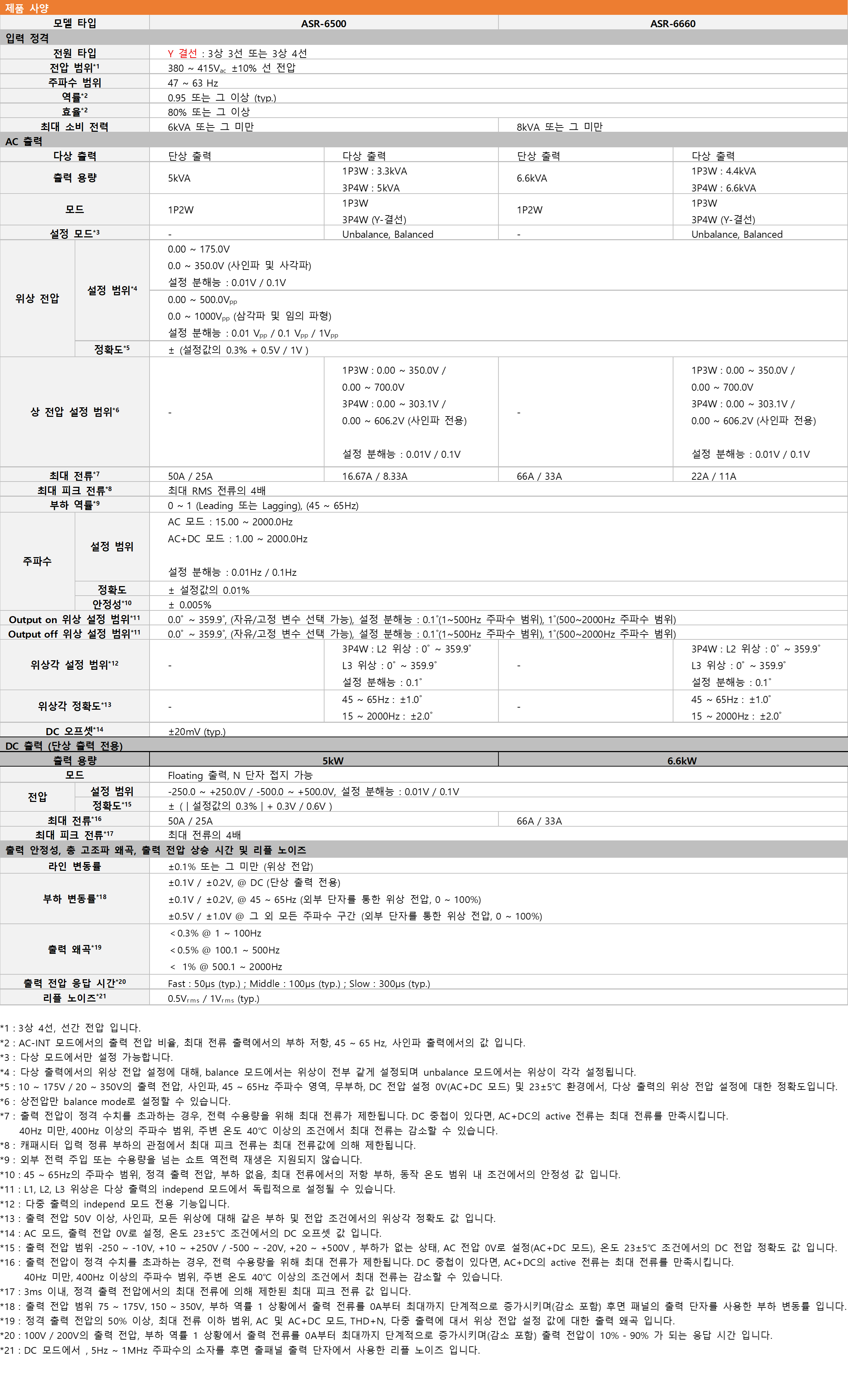 ASR-6000 시리즈는 ASR-6450 (AC/DC 4kVA), ASR-6600 (AC/DC 6kVA) 및 ASR-6500 (AC/DC 5kVA), ASR-6660 (AC/DC 6.6kVA) 4가지 모델로 분류되어 있습니다.