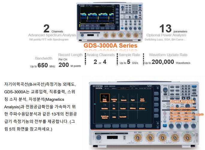 GDS-3000A 시리즈는 GW Instek의 최신 디지털 스토리지 오실로스코프 제품으로, 주요 특징은 다음과 같습니다: